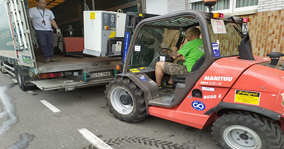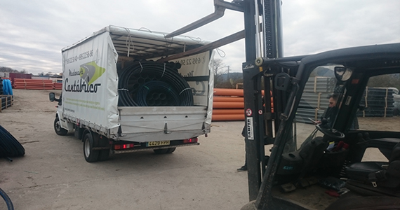 Foto de un elevador y una de nuestras furgonetas.