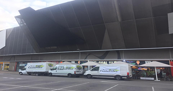Foto de nuestros vehículos frente al estadio de fútbol, "El Molinón".