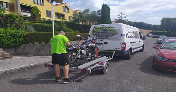 Foto de furgoneta y carro cargado con moto.